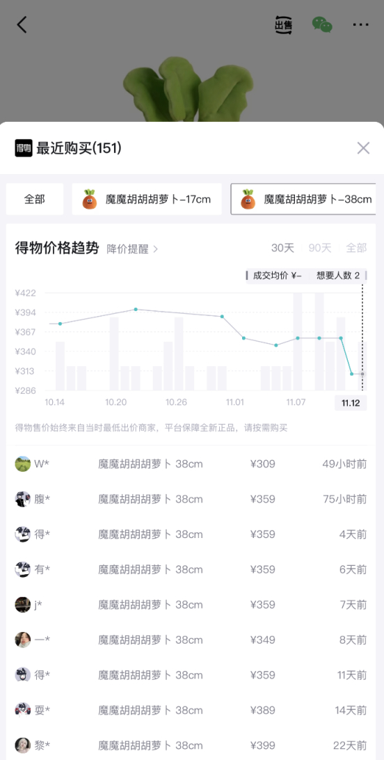 值得一提的是,在粉丝热情追捧下,部分明星IP毛绒玩具已出现市场溢价。例如原价159元与299元的“卜卜”,在得物平台平均成交价已升至189元与359元。轻微溢价,反过来也进一步点燃了粉丝的收藏与购买热情。